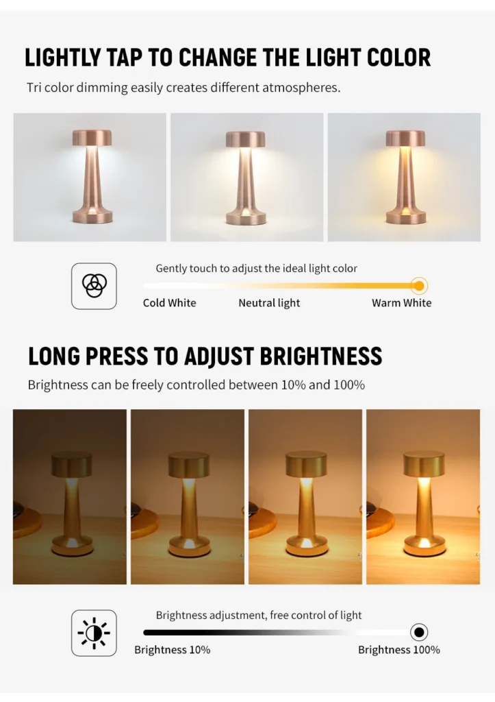 This cordless LED lamp is both functional and elegant. With three color modes, touch control, and stepless dimming, it’s perfect for reading or creating a cozy atmosphere. The wireless design and long battery life make it easy to move around, while its metal build adds durability and style. A great addition to any space!